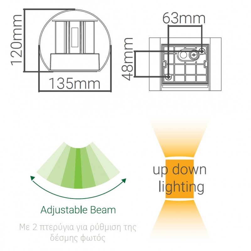 Φωτιστικό επίτοιχο απλίκα Up-Down LED 2x5W 230V, με πλήκτρο επιλογής χρώματος φωτισμού, θερμό φως, λευκό φως ημέρας και ψυχρό φως.